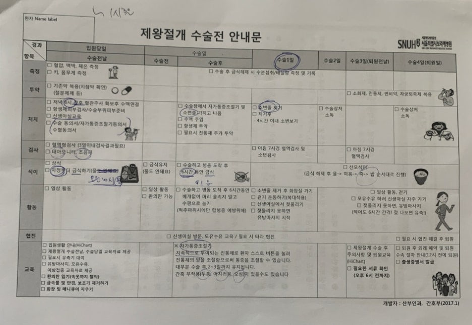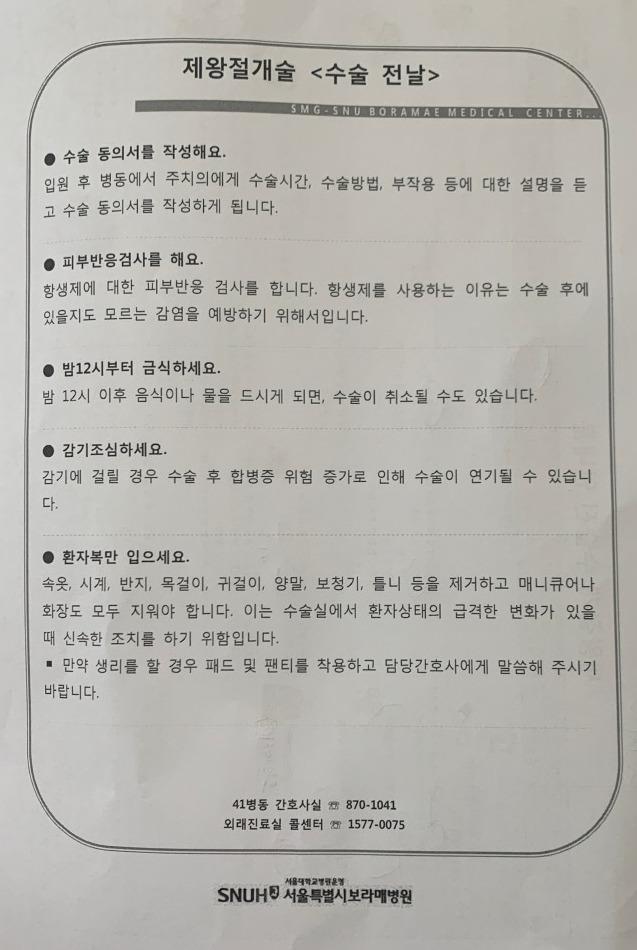간단한 질의응답(병력, 알러지 유무 등) 후 제왕절개 수술전 안내를 받는다. 보통 제왕절개는 4박5일정도로 입원하는데, 수술후 실밥까지 풀고 퇴원하게된다면 7박8일간 입원하게 된다. 조리원에 있다가 실밥풀려고 다시 외래오는건 힘들것 같아서 7박8일간 입원생활을 선택했다.